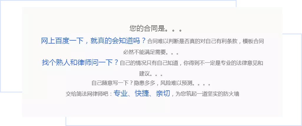 1、咨询答疑不限时 2、依据实际需求定制合同 3、提示合同风险和法律建议 4、百姓卡和创业者会员专属优惠折扣 |